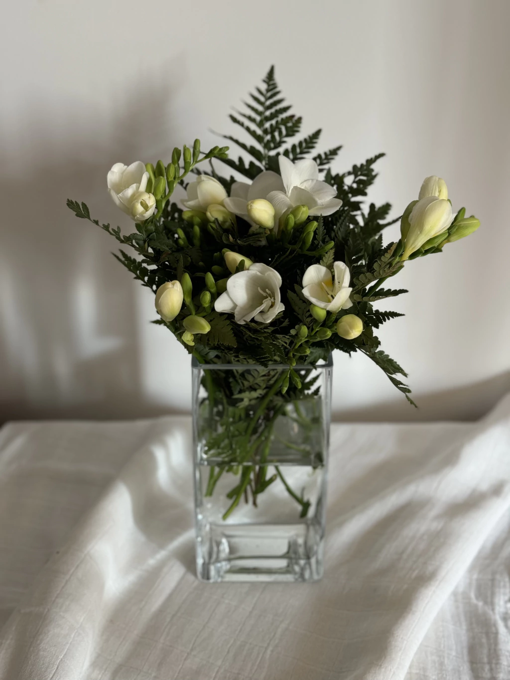 Dale un toque de elegancia y frescura a cualquier espacio con este hermoso florero de vidrio transparente. Ideal para arreglos florales, ramas o flores secas.